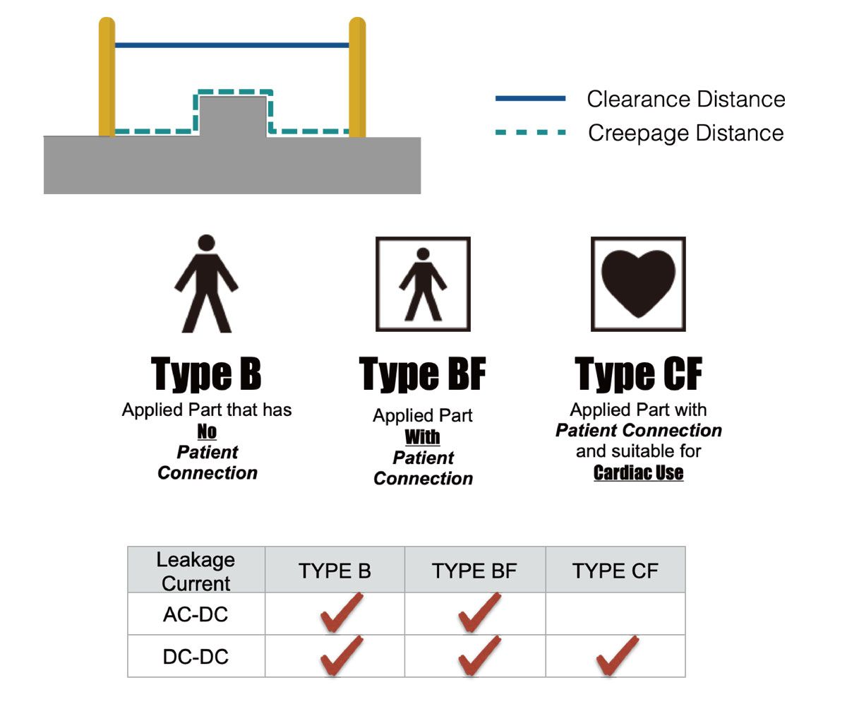 For at forhindre elektriske farer og forbedre enhedens sikkerhed er isolering en faktor, der kan være meget kritisk. Galvanisk isolering og minimering af lækstrømme kan bruges til at reducere risici og beskytte patienter og plejepersonale. Lækstrømme og krybeafstande reguleres af forskellige definerede grænseværdier afhængigt af kategorien: